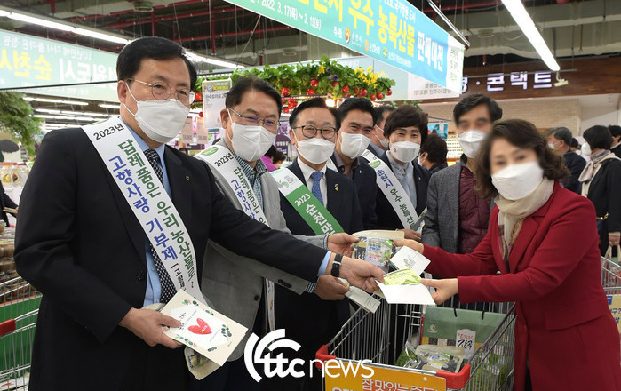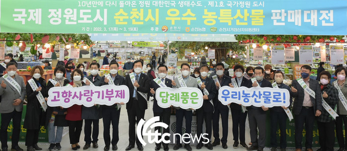 | ▲ 17일 서울 도봉구 농협하나로마트 창동점에서 열린 “순천시 우수 농특산물 판매 대전”에서 순천시 부시장 손점식(사진 왼쪽에서 세 번째), 순천농협 조합장 강성채(사진 왼쪽에서 두 번째), 농협유통 전무이사 김태룡(사진 왼쪽에서 첫 번째) 등이 참석하여, 순천시의 우수한 농특산물과 함께 ‘2023 순천만 국제정원 박람회’와 ‘고향사랑 기부제’를 홍보하고 있다.(사진=농협유통 제공) |