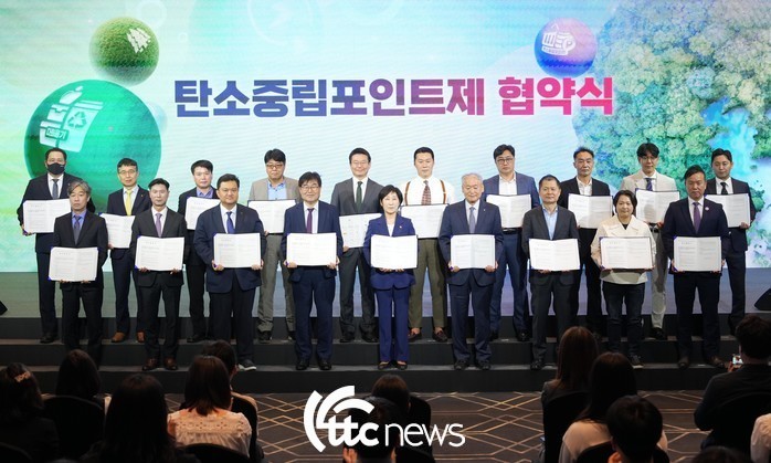 21일 환경공단은 한화진 환경부 장관이 참석한 가운데 코엑스 그랜드볼룸에서 탄소중립포인트제(녹색생활 실천분야)의 활성화와 국민의 탄소중립 실천활동의 참여기회 확대를 위해 전자영수증 발급 등 탄소중립 실천항목 분야별 17개 기업이 새로 제도에 참여하는 업무협약을 체결했다.