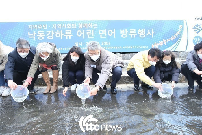 | ▲ 박재현 한국수자원공사 사장(왼쪽에서 네 번 째) 지난 이 3월 2일 낙동강하굿둑 상류의 삼락생태공원에서 지역주민과 함께 어린 연어를 방류하고 있다. 이날 행사는 낙동강의 생태복원과 어족자원 증대를 위해 실시되었으며, 지역주민 등과 함께 낙동강하류에 어린 연어 5만 마리를 방류하였다. 한국수자원공사는 올해 하굿둑 개방 시범운영과 연계하여 지속적인 생태복원 사업을 추진하고, 정부, 지자체, 관계기관과 공동으로 하구통합물관리를 구체화할 예정이다.(자료사진=한국수자원공사 제공) |