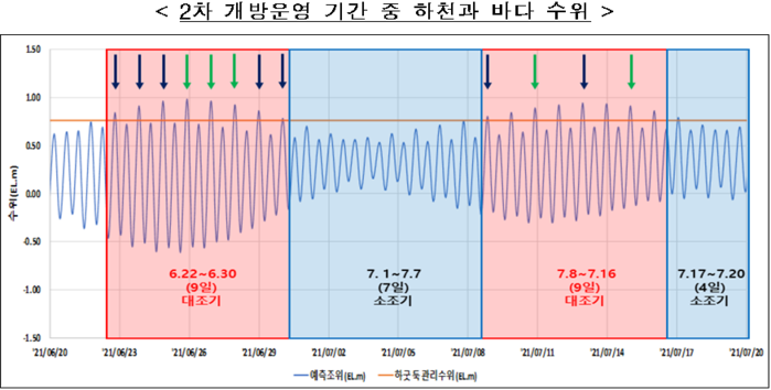 개방운영 기간 동안 바닷물과 강물의 밀도 차이에 의해 바다조위가 하천수위보다 낮은 상황에도 바닷물이 유입되는 현상이 확인되었으며, 수문 1기를 위 또는 아래로 열어두어 바닷물고기가 상류로 이동할 수 있도록 한 생태소통 기간(개방운영 기간과 동일)에도 추가로 바닷물이 유입됐다.
