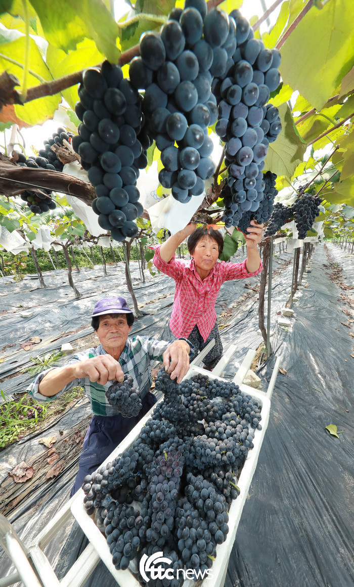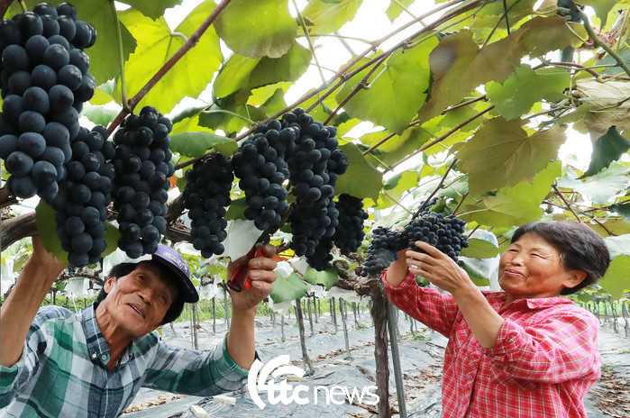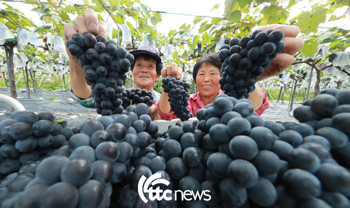 8일 경남 함양군 안의면 도림리 포도밭에서 이상식씨 부부가 긴 장마와 태풍을 견디고 탐스럽게 잘 영근 캠밸 포도를 수확하고 있다.