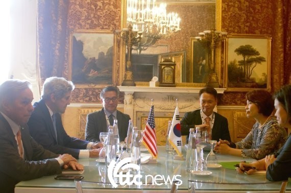 | ▲ 한정애 환경부 장관(오른쪽 두번째)이 23일(현지시간) 오전 이탈리아 나폴리 왕궁에서 존 케리(John Kerry) 미국 기후특사와 양자회담을 갖고 있다(사진=환경부 제공) |