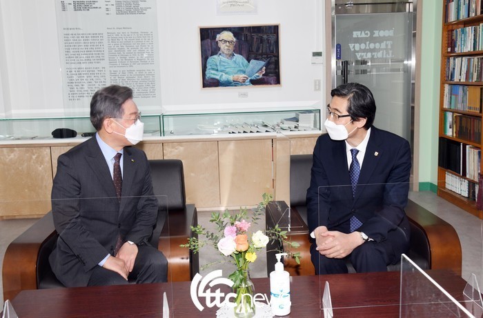 | ▲ 제27회 한신상 수상자 이재명 경기도 지사(왼쪽)과 연규홍 한신대 총장이 담소하고 있다. |