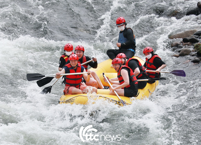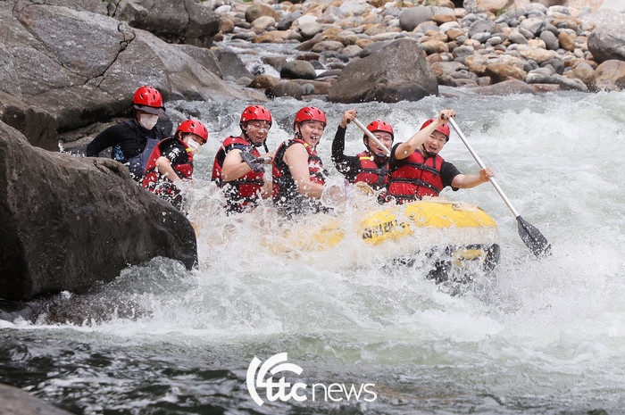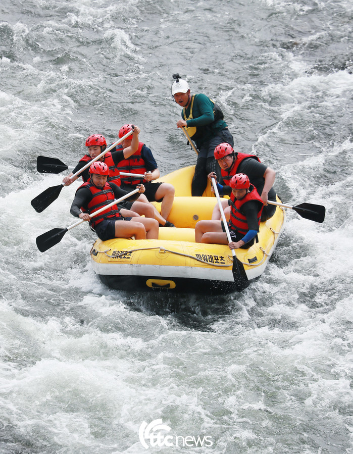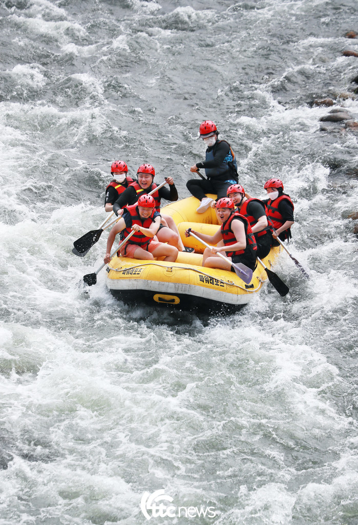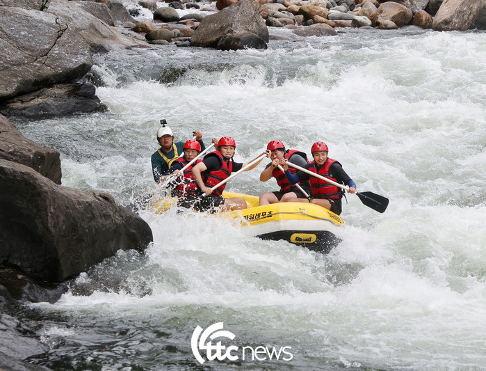 | ▲ 24일 경남 함양군 휴천면 엄천강에서 피서객들이 물살을 가르며 래프팅을 즐기고 있다.(사진=함양군 김용만 주무관 제공) |