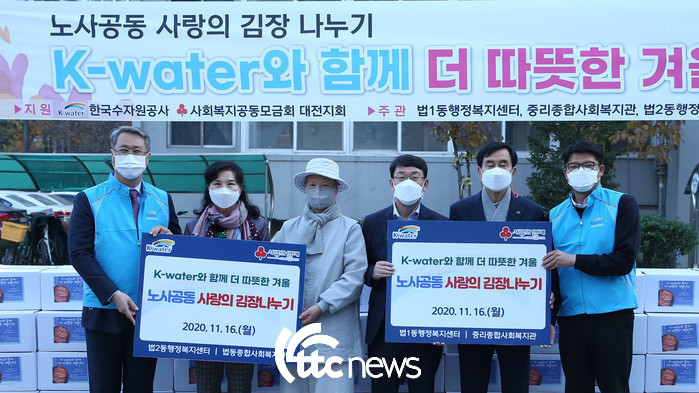 이를 위해, 먼저 11월 16일 오후 4시 대전시 대덕구 법1동 행정복지센터 광장에서 한국수자원공사 노사가 함께 취약계층 600세대에게 김장김치 3천여 포기를 전달했다.