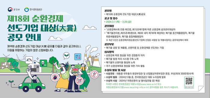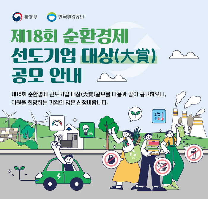 한국환경공단(이사장 안병옥)은 폐기물 감량 및 순환이용과 재활용 활성화로 지속가능한 순환경제사회로의 전환에 기여한 기업을 발굴하고자 ‘제18회 순환경제 선도기업 대상’을 공모한다.