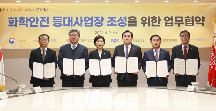 한국환경공단(이사장 안병옥)은 3일 오후 서울 여의도 중소기업중앙회에서 환경부, 중소기업중앙회, 한국표면처리공업협동조합, 한국페인트잉크공업협동조합, 한국금속재자원산업협회와 ‘화학안전 등대사업장 조성사업’추진을 위한 업무협약을 체결했다.
