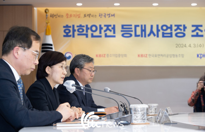 | ▲ 한화진 환경부 장관(왼쪽에서 두 번째)은 3일 화학안전 등대사업장 조성을 위한 업무협약식에 참석해 인삿말을 전하고 있다.(사진=환경부 제공) |