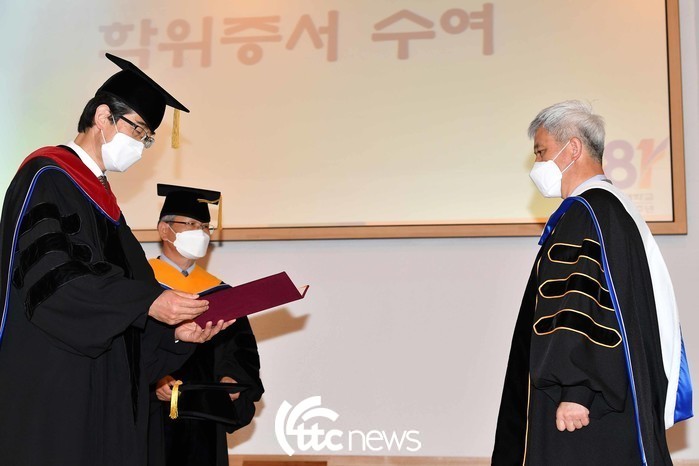 | ▲ 한신대학교(총장 연규홍)가 13일 한신대 경기캠퍼스 샬롬채플에서 박규홍 오산 시장(오른쪽)에게 명예문학박사학위를 수여하고 있다. |