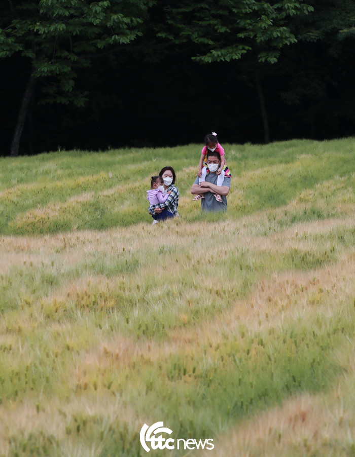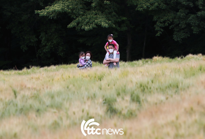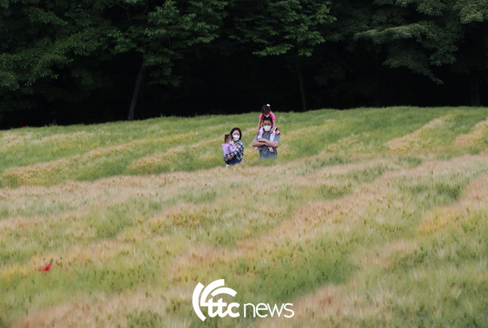 비가 그친 17일 경남 함양군 상림공원에서 한 가족이 누렇게 익어가는 청보리밭 사잇길을 걷고 있다.