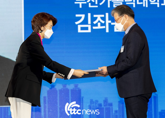 | ▲ 22일 오후 부산광역시 벡스코(BEXCO)에서 2021년 ’세계 물의 날‘ 기념식에서 한정애 한경부 장관(왼쪽)이 물관리 분야에 이바지한 김좌관 부산가톨릭대 교수에게 훈장(홍조근정)을 전수하고 있다. |
