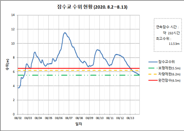 서울시 용산구와 서초구를 연결하는 잠수교가 2020년 8월 3일 오전 6시 40분부터 10일(232시간)간 연속으로 ’완전 잠수‘ 기준 수위인 6.5m를 초과하여 통행이 제한됐다. 이는 기존 역대 최장 잠수 기간은 1981년 7월 2일부터 8일까지 141시간을 넘어서 역대 잠수교 ’완전 잠수‘ 최장 기록을 경신했다.