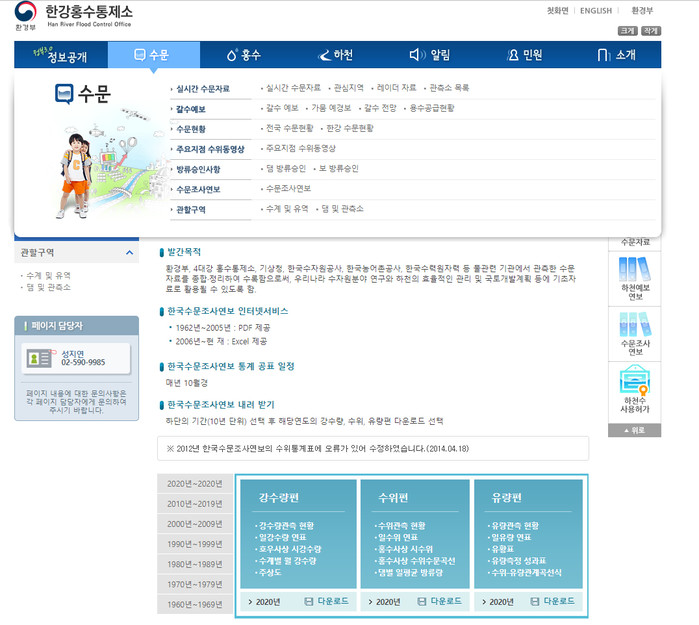 ‘2020 한국수문조사연보’는 전국 하천의 주요지점 수위를 비롯해 하천 유역의 강수량 등 전국 2040개 지점의 수문 자료를 담은 것으로 환경부 관측 지점 외에 물전문 기관인 한국수자원공사를 비롯한 농어촌공사와 한국수력원자력 등 관련 기관의 자료도 포함됐다.