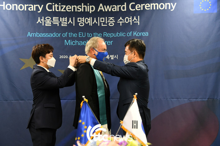서정협 서울시장 권한대행은 19일 서울시청에서 4년의 임기를 마치고 오는 31일 귀임하는 미하엘 라이터러(Michael Reiterer) 주한EU대사에게 외국인 명예시민증을 수여했다.
