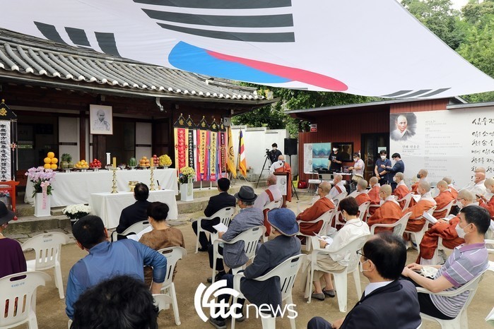 29일 오전 만해 한용운 선생이 말년을 보낸 심우장(성북구 성북로29길 24)에서 진행된 ‘만해 한용운 선사 77주기 추모다례재’는 성북문화원, 재단법인 선학원·정법사가 공동으로 주최·주관하고 성북구청과 국가보훈처, 만해한용운선양사업지방정부행정협의회가 후원했다.