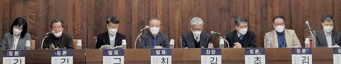 | ▲ 사진 왼쪽부터 김경민국회입법조사처 환경노동팀 입법조사관,, 김동환 환경국제전략연구소 소장, 구자건 전 연세대 환경에너지공학구 교수, 최병성 전국시멘트대책위원회 상임대표, 김승호 전 강원대 교수, 추태호 부산대학교 토목공학과 교수, 김영선 더불어민주당 수석전문위원, 홍동구 환경부 자원순환국장. |