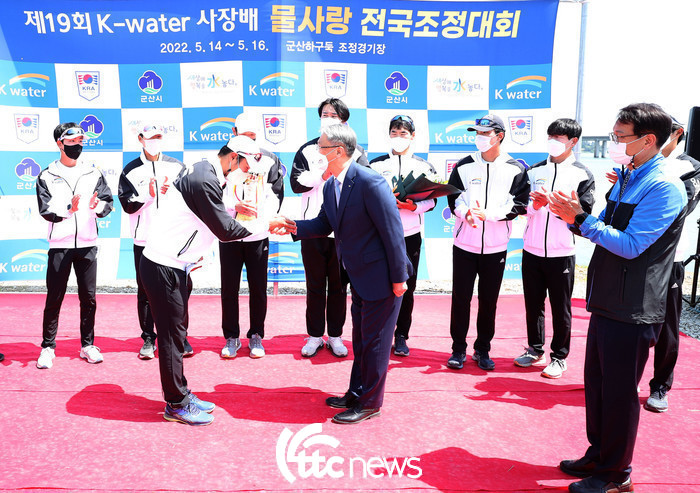 | ▲ 16일 박재현 한국수자원공사 사장이 전북 군산시 금강 하굿둑 조정경기장에서 진행된 ‘제19회 한국수자원공사(K-water) 사장배 물사랑 전국조정대회’ 남자일반부 종합우승을 차지한 K-water팀 주장 이종하 선수에게 시상하고 있다.(사진=한국수자원공사 제공) |