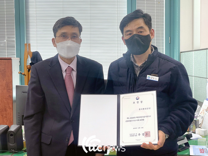 | ▲ 한국환경공단은 지난 20일, 혁신지향 공공조달 우수기관으로서의 공로를 인정받아 경제부총리 겸 기획재정부장관 표창을 인천지방조달청으로부터 전수받았다. 인천지방조달청 이병권 경영관리과장(왼쪽)과 한국환경공단 이민복 경영지원처장이 기념촬영하고 있다(사진=한국환경공단 제공) |