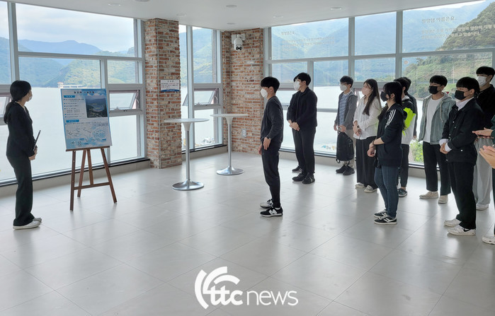 | ▲ 7일 인제대학교 학생들이 K-water 수자원 시설물 견학의 일환으로 밀양다목적댐을 방문해 댐의 제원과 기능에 대한 설명을 청취하고 있다.(사진=K-water부울경 본부 제공) |