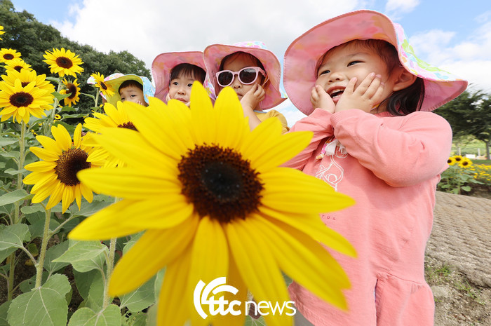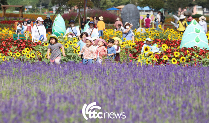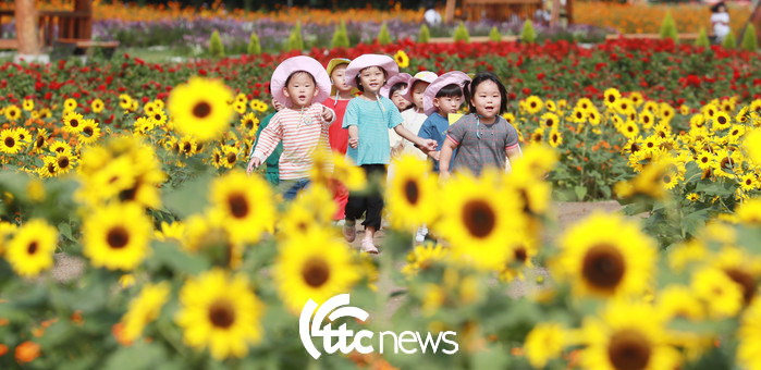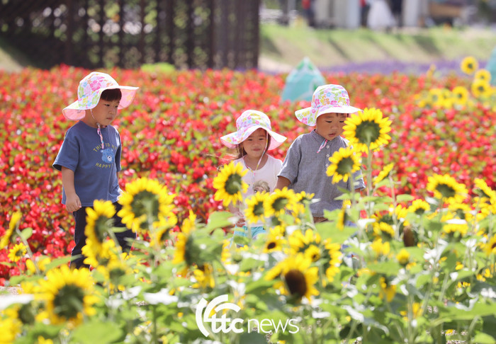 21일 경남 함양군 상림공원 경관단지를 찾은 성민어린이집 아이들이 활짝 핀 해바라기 꽃길을 걸으며 가을 향기를 만끽하고 있다.