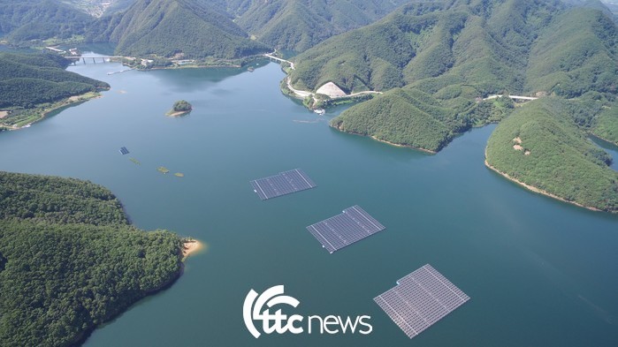 | ▲ 한국수자원공사는 `21년 현재 합천댐, 소양강댐 등 5개 댐 8개 사업을 추진하여 147.4MW를 개발 중이다. 사진은 충주다목적댐 수면에 설치된 수상태양광(티티씨뉴스 자료사진) |