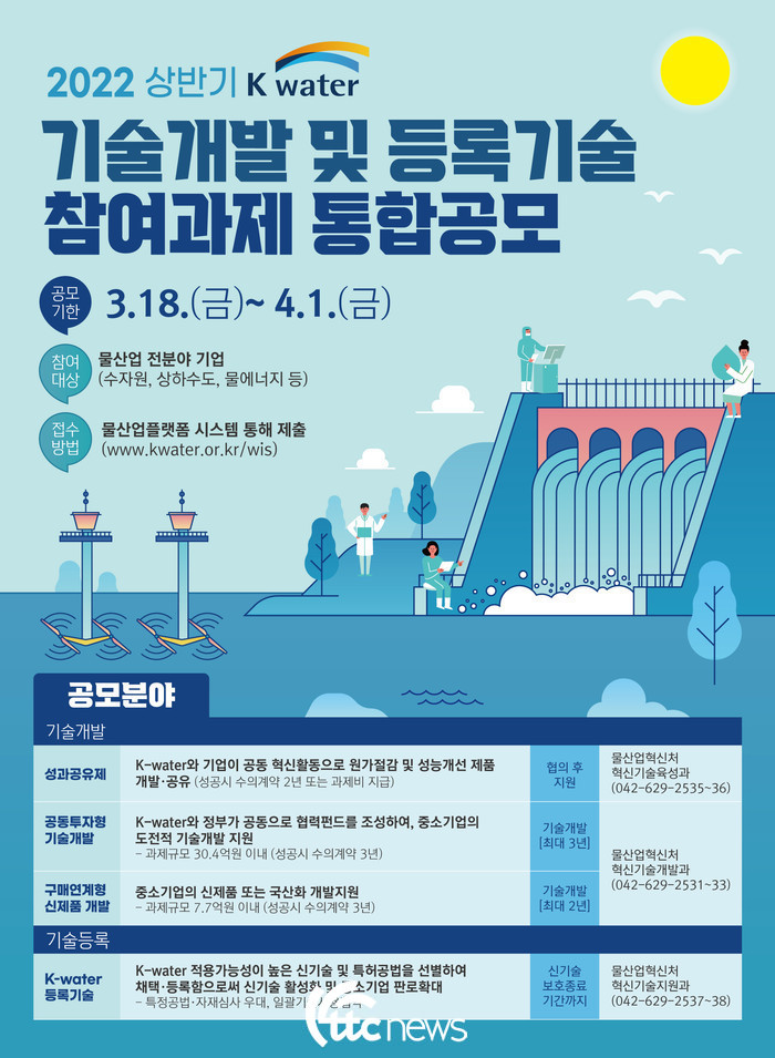 한국수자원공사는 국내 물산업 중소기업의 체계적인 육성과 혁신 생태계 조성을 지원하기 위해, 3월 18일부터 4월 1일까지 “2022년 상반기 중소기업 지원제도 통합공모”를 실시한다고 밝혔다.