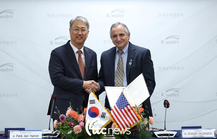 | ▲ 한국수자원공사는 24일 대전시 대덕구 본사에서 미국수도협회와 상수도 분야 기술협력을 위해 손을 맞잡았다. ‘상수도 분야 협력을 위한 양해각서’를 체결하고 박재현 한국수자원공사 사장(사진 왼쪽)과 조셉 자칸젤로 (Dr. Joseph Jacangelo) 미국수도협회(AWWA) 회장이 기념촬영하고 있다(사진=한국수자원공사 제공) |