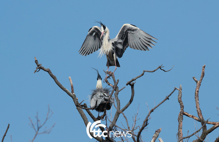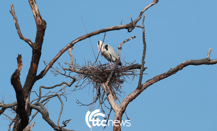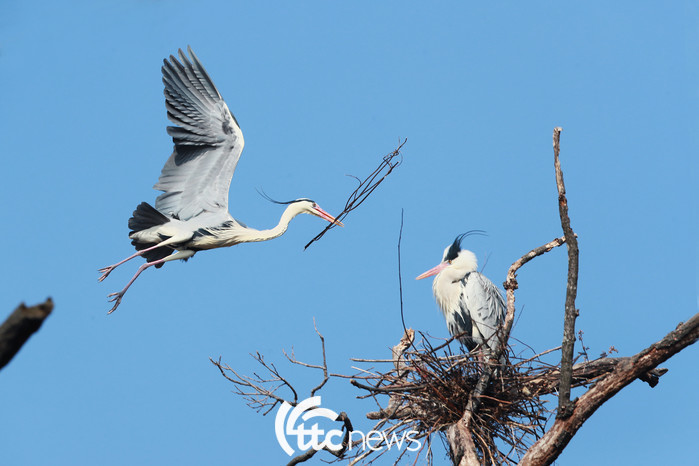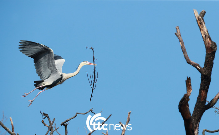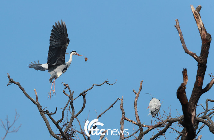 포근한 날씨를 보인 9일 경남 함양군내 한 왜가리 서식지에서 봄 햇살을 받으며 왜가리들이 분주하게 둥지를 만들고 있다.