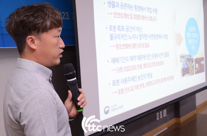 로봇 사용주체가 농민인데 지식습득 및 자본 부족, 불규칙한 노지현장에서 적용이 애로점, 자연 기후환경에 대한 변화에 따른 작업 고충이 있다고 말했다.