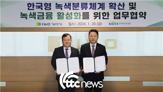 한국환경산업기술원(원장 최흥진)은 1월 26일 서울 영등포구 63스퀘어 기술보증기금 영상회의실에서 한국형 녹색분류체계를 녹색기술시장에 확산하고 우수한 녹색기술을 보유한 중소·중견기업의 녹색투자 저변을 확대하기 위해 기술보증기금(이사장 김종호)과 업무협약을 체결했다.