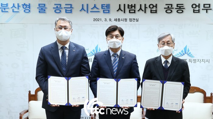| ▲ 9일 박재현 한국수자원공사 사장(왼쪽)과 세종특별자치시 이춘희 시장(가운데), 한국물기술인증원 민경석 원장(오른쪽)이 ‘분산형 물 공급 시스템 시범사업 업무협약’을 체결한 후 기념촬영하고 있다.(사진=한국수자원공사 제공) |