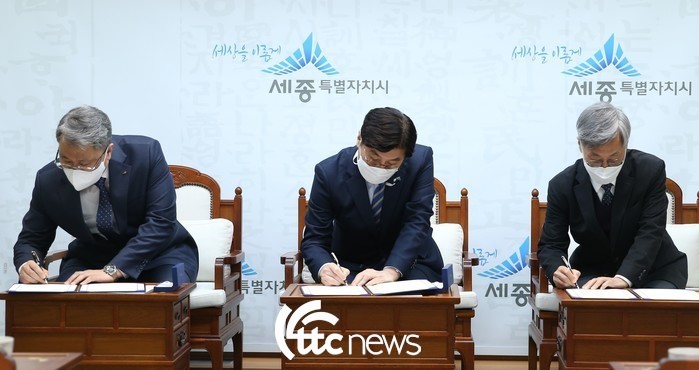 | ▲ 9일 박재현 한국수자원공사 사장(왼쪽)과 세종특별자치시 이춘희 시장(가운데), 한국물기술인증원 민경석 원장(오른쪽)이 ‘분산형 물 공급 시스템 시범사업 업무협약’에 서명하고 있다.(사진=한국수자원공사 제공) |