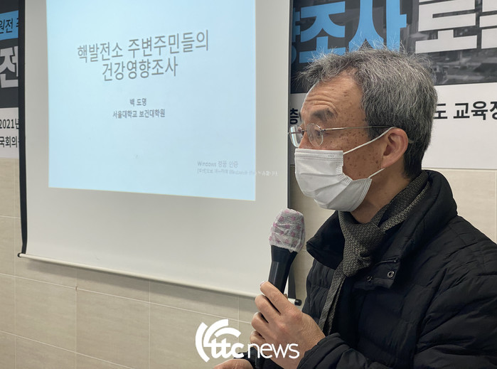 이어 서울대 보건대학원 백도명 교수가 “핵발전소 주변 주민들의 건강영향조사”를 주제로 발표에 나섰다.