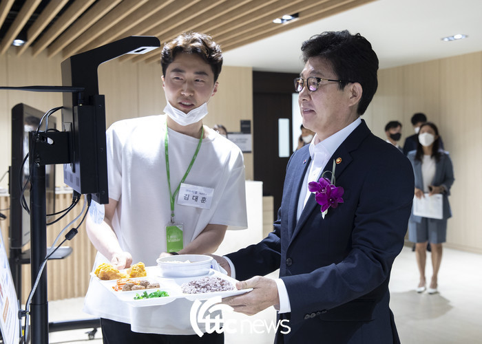 | ▲ 26일 그린 중소벤처기업의 혁신성장을 위한 환경부와 중소벤처기업부 간의 업무협약식장으로 이동중 조명래 환경부 장관(오른쪽)이 환경기업 개발기술인 (주)누비랩의 식습관 분석을 통한 개인 맞춤형 건강솔루션을 시연하고 있다. 사진 왕보현 기자 |