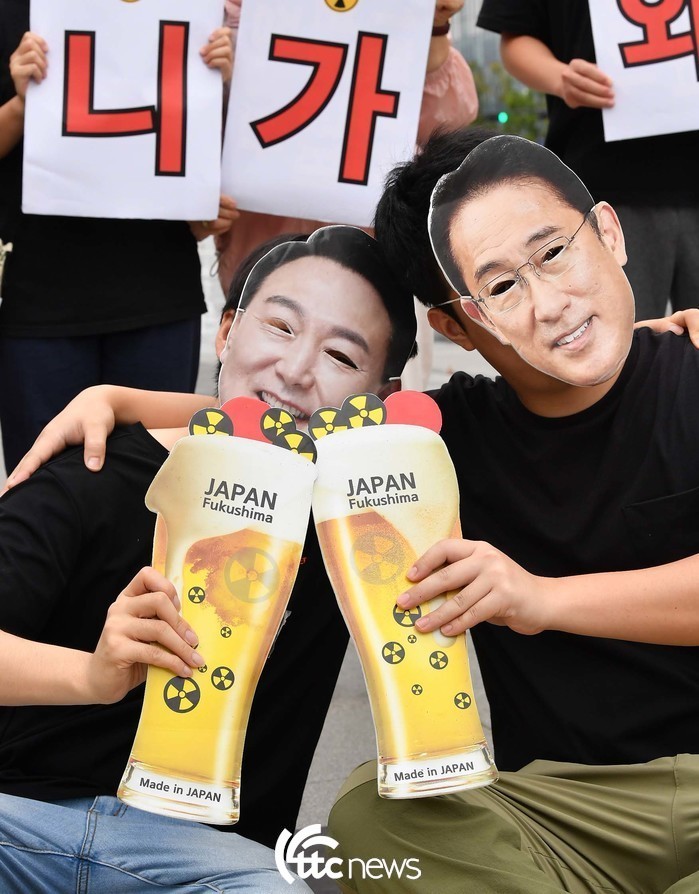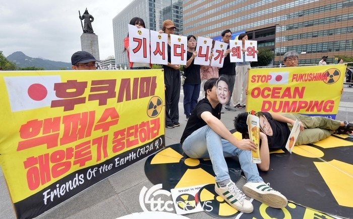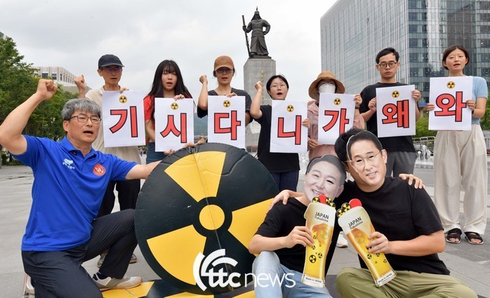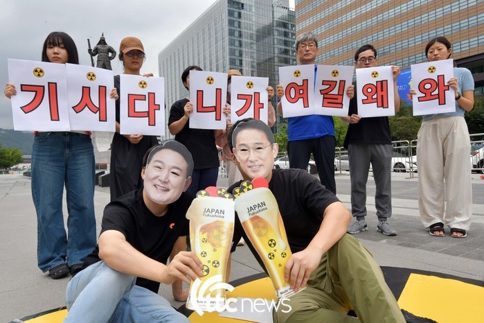 환경보건시민센터, 환경운동연합 바다위원회, 서울환경운동연합, 환경운동연합 등 환경단체 회원들이 5일 오전 서울 광화문광장에서 ‘기시다 후미오 일본 총리 방한 반대 및 후쿠시마 오염수 해양투기 중단 촉구’ 기자회견 및 퍼포먼스를 진행하고 있다.