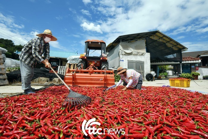 맑고 투명한 하늘아래 강렬히 햇볕이 내리쬐는 19일 오후, 경기도 이천시 호법면 동산리의 한 농가에서 노부부가 잘 익은 고추를 말리고 있다.