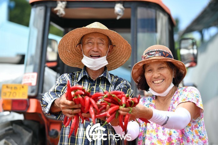 | ▲ 경기도 이천의 한 농가에서 노부부가 여름 동안 정성스럽게 가꿔 수확한 고추를 들고 환하게 웃고 있다. |