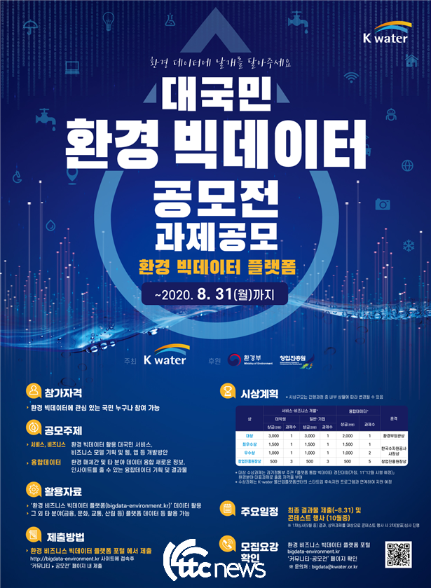 한국수자원공사는 15일부터 8월 31일까지 ‘환경 빅데이터를 활용한 대국민 공모전’ 참가자를 모집한다고 밝혔다.
