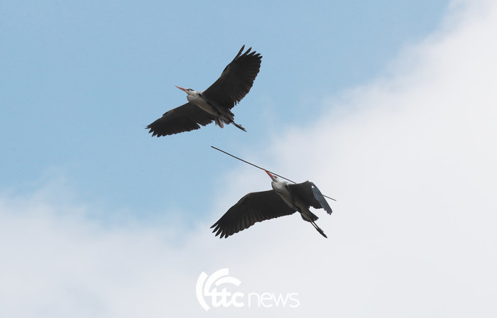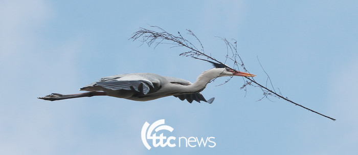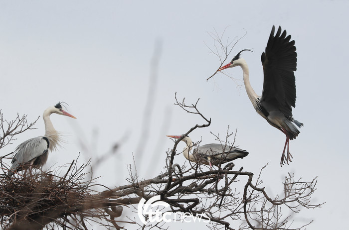 봄기운이 완연한 12일 경남 함양군의 한 왜가리 서식지에서 왜가리들이 나뭇가지를 입에 물고 분주하게 집짓기를 하고 있다.