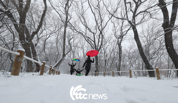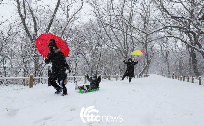 ▲ 18일 오전 함박눈이 내리는 함양 상림공원에서 한 가족이 눈썰매를 즐기고 있다(사진=함양군 김용만 주무관 제공)