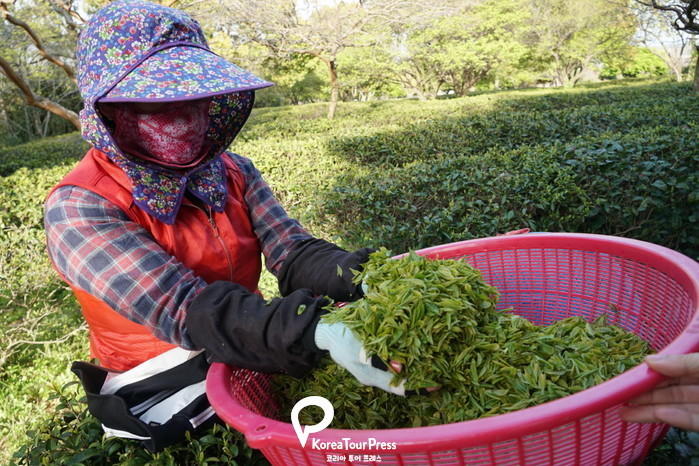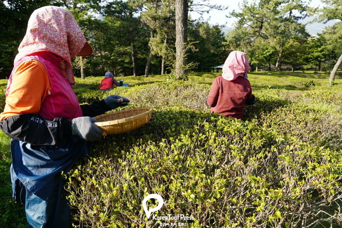 | ▲ 절기상 곡우(穀雨)를 사흘 앞둔 16일 해남 설아다원의 햇차 수확이 한창이다. 해남 두륜산 자락에 위치한 설아다원은 유기농 차 재배지이자 차 체험과 한옥스테이, 전시, 음악, 공연 등 자연 속 쉼과 예술을 결합시킨 복합문화 예술농장이다.(사진=해남군 제공) |