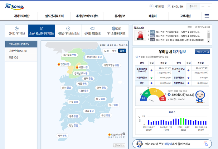 | ▲ 4차 미세먼지 계절관리제(‘22.12~’23.3)를 대비해 한국환경공단은 전국의 대기 현황을 한눈에 파악할 수 있고, 원하는 대기 정보도 얻을 수 있는 실시간 대기환경 정보공개 서비스인 ‘에어코리아(Airkorea)‘을 통해 국민들에게 ‘고농도 초미세먼지 예보 정보 조기 제공 서비스’를 제공한다(에어코리아 누리집 갈무리) |