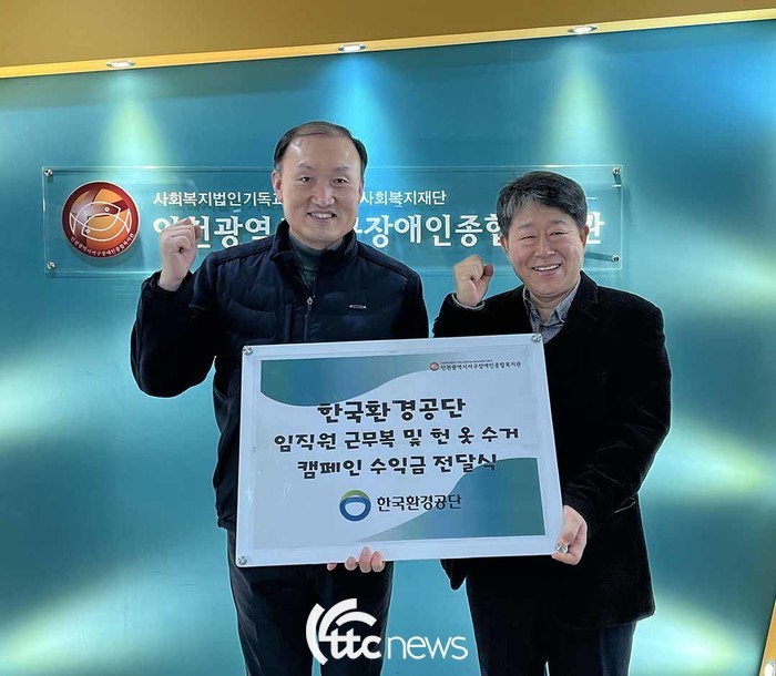 | ▲ 27일 옥승철 한국환경공단 자원재활용처장(왼쪽)이 인천 서구 장애인종합복지관에 임직원 근무복 및 헌옷수거 캠페인 수익금을 전달하고 있다(사진=한국환경공단 제공) |