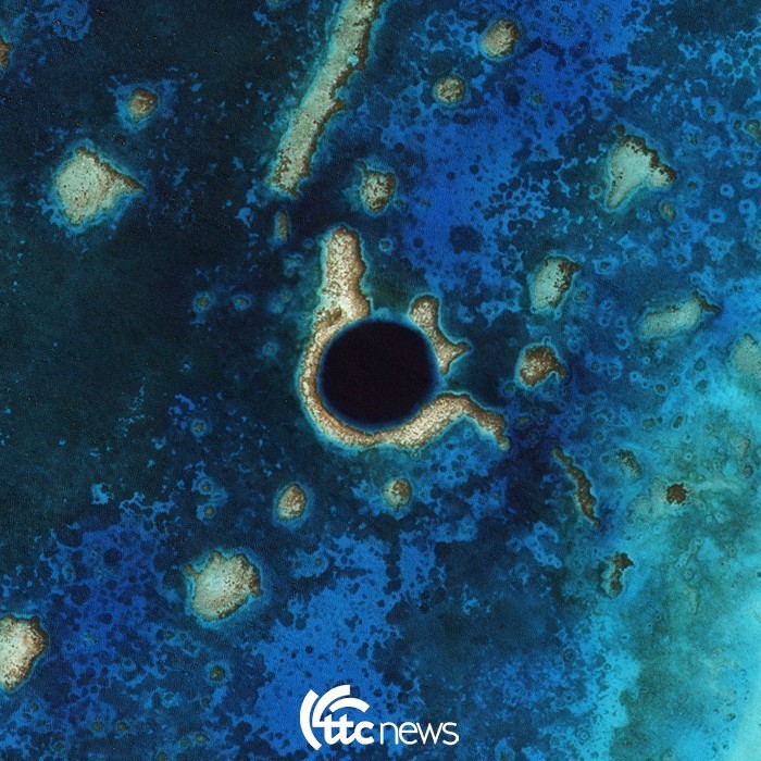 | ▲ 중미 벨리즈의 그레이크 블루홀 그레이트 블루홀은 벨리즈 해안 근처에서 볼 수 있다. 이 곳은 라이트하우스 리프의 중앙 근처에 있으며, 본토와 벨리즈 시티로부터 70 km (43 mi) 떨어진 곳에 위치한 작은 환초지대이다. 구멍은 원의 형태를 띄며 지름 300 m (984 ft)에 깊이 124 m (407 ft)이다. 그레이트 블루홀은 플라이스토세 빙하기 동안 해수면이 매우 낮았을 때 형성된 것으로 보이며, 종유석을 분석해보면 153,000년 전과 66,000년 전, 그리고 60,000년 전과 15,000년 전에 걸쳐 형성된 것으로 보인다. 해수면이 다시 상승하자 동굴은 침수되었다. 그레이트 블루홀은 벨리즈 산호초 보호지역에 속해 있으며 유네스코(UNESCO)에 세계자연유산으로 등록되어 있다.(사진설명=위키백과, 사진=항공우주연구원 제공) |