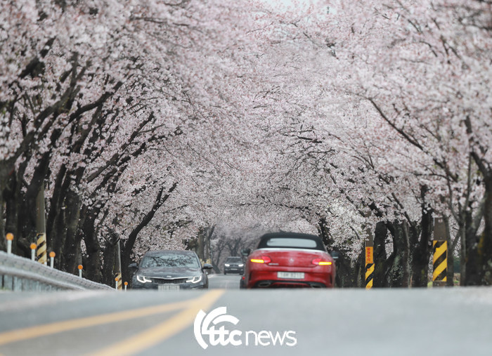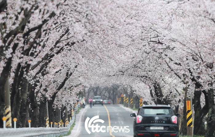 봄비가 내린 4일 경남 함양군 백전면 오십리 벚꽃길을 차량들이 지나고 있다.