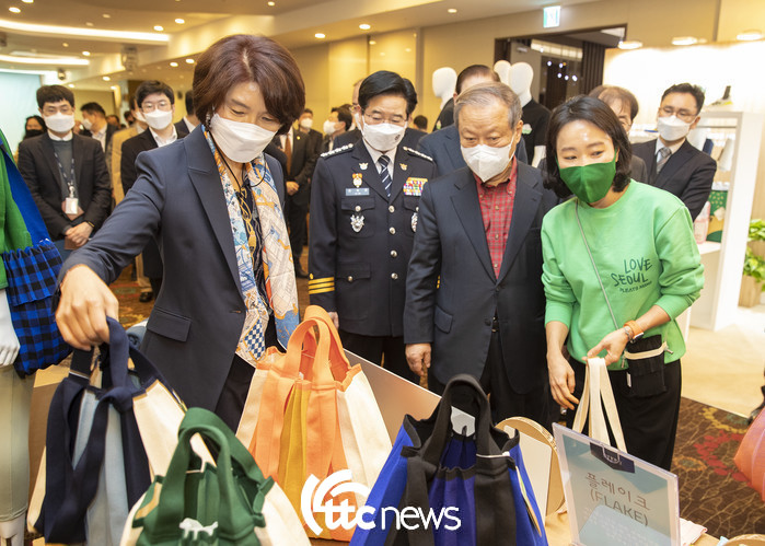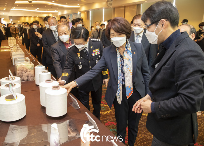 | ▲ 15일 서울 중구 프레지던트호텔에서 열린 ‘재활용 의류 시범구매 및 사용 확대 행사’ 에서 한정애 환경부 장관과 김창룡 경찰청장, 최영 환경재단 이사장, 이상운 섬유산업연합회 회장이 등이 투명 페트병재활용과정을 살펴보고 있다. |