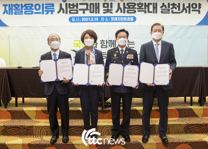 환경부는 15일 서울 중구 프레지던트 호텔에서 국방부, 경찰청, 섬유산업연합회와 투명 페트병으로 만든 기능성 의류를 시범 구매하는 자원순환 서약식을 개최했다. 이 자리에서 국방부는 1만 벌, 경찰청은 2,000벌의 재활용 의류를 구매하기로 약속했다.
