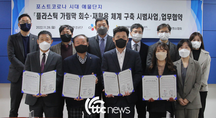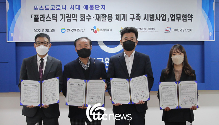 | ▲ 코로나 방역조치로 설치된 ‘플라스틱 가림막’이 사회적 거리두기 해제로 해체되어 배출되자 적정 처리를 위해 한국환경공단 수도권서부환경본부(본부장 방현홍), CJ프레시웨이㈜(본부장 배수영), (사)한국플라스틱단일재질협회(회장 구제봉) 및 (사)한국청소협회(회장 윤경열)는 28일 업무협약을 체결했다.(사진=한국환경공단 제공) |