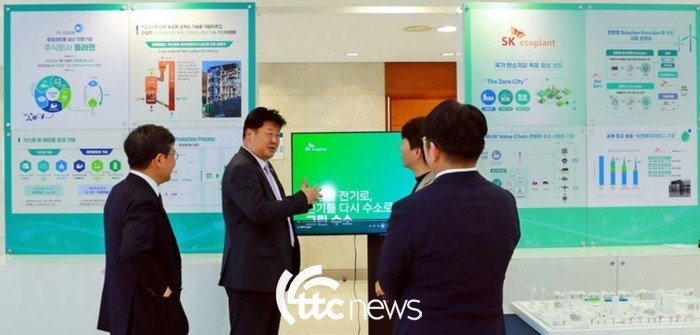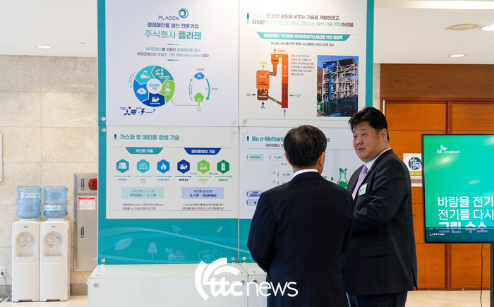 | ▲ 탄소중립녹색위 전체회의에서 별도 전시공간이 마련됐다. (주)플라젠과 SK에코플랜트가 함께 그린수소, 청정메탄올 생산에 대해 설명하고 있다. |