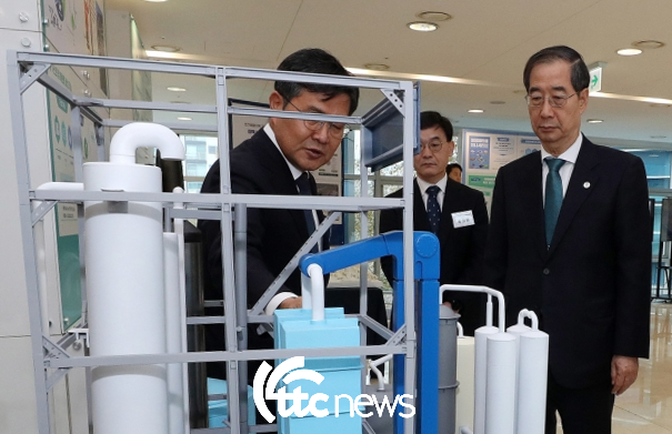 ▲ 플라젠 경국현 대표가 한덕수 총리에게 정부의 탄소중립목표에 기여하는 자사의 청청 메탄올 생산 플랜트를 설명하고 있다. |
